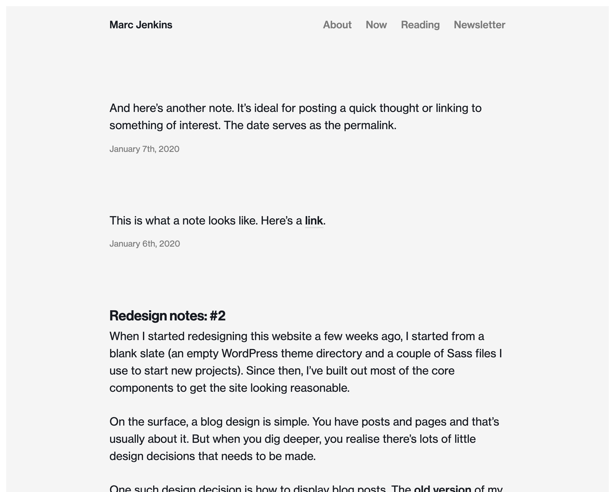 This is the design I’ve ended up with. Very much inspired by Manton, I now have two types of post: a standard post and a note. I’m still experimenting with the format, but I hope that now that a post can be tweet-sized, it’ll make it easier to get back into the habit of publishing.