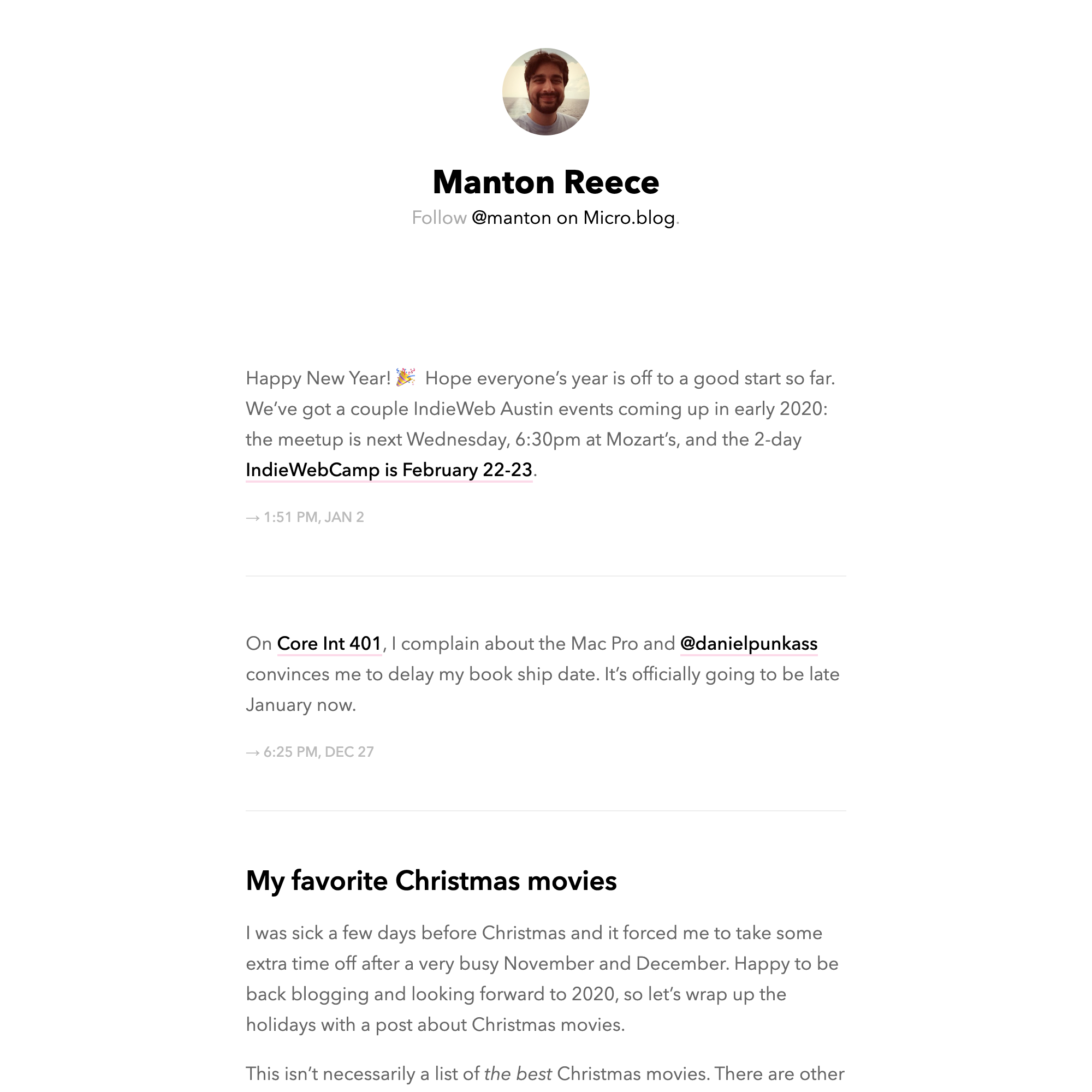 Manton’s blog has two types of posts: full articles and microposts. This is the approach I decided I wanted to take. Sometimes I just want to a share a thought or a link and several lines of text is all that is required. This smaller bite-size approach to blogging is called microblogging (incidentally, Manton runs micro.blog).